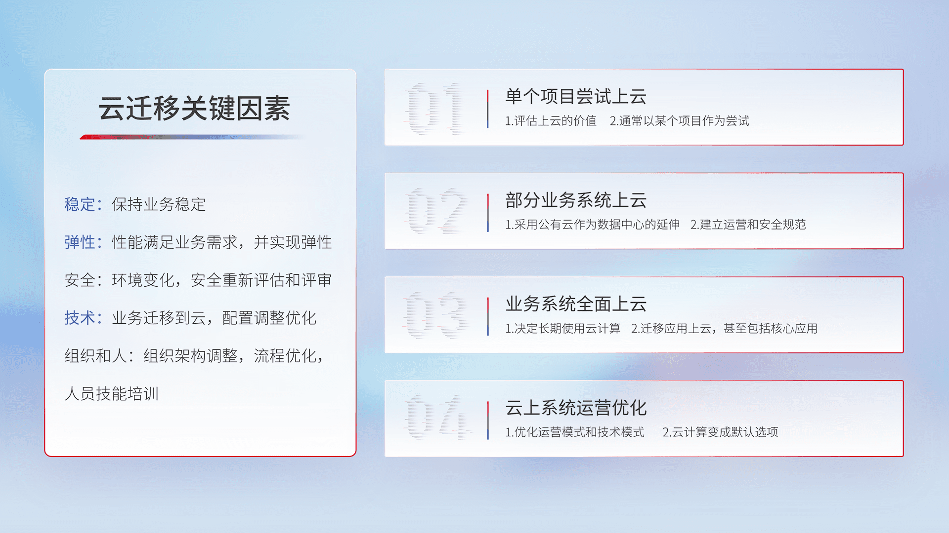 结合实际业务,,,从规划设计、、、、云平台选型、、云原生改造、、数据迁移、、、、集成交付,,,迁移全过程为客户识别最佳上云路径,,做好风险识别管理,,,设计网络架构、、、身份权限、、、、安全审计合规、、、、操作审计、、、、日志审计、、、、监控告警策略、、、多站点容灾设计等,,,,对云上基础设施进行整体规划,,提升IT治理水平,,以满足弹性、、高可用、、、、高性能的需求。。。